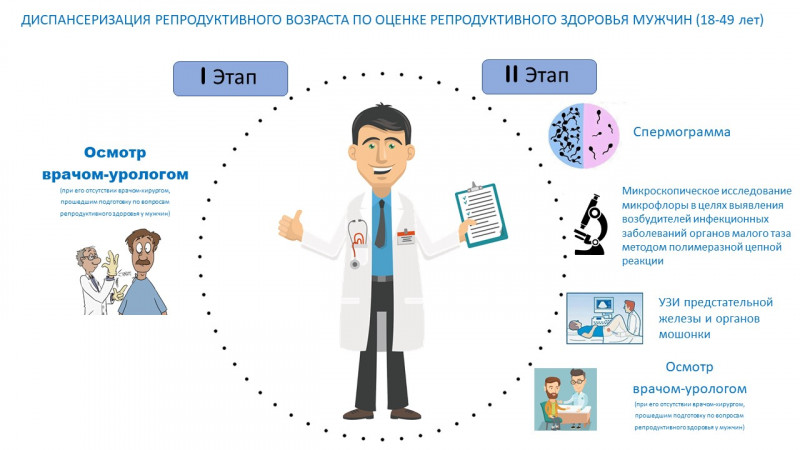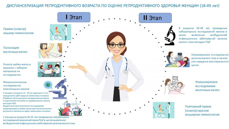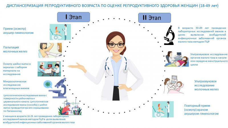 Для женщин и мужчин репродуктивного возраста поэтапно, в зависимости от возрастных групп, организуется проведение диспансеризации, направленной на оценку репродуктивного здоровья.