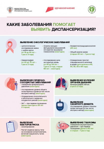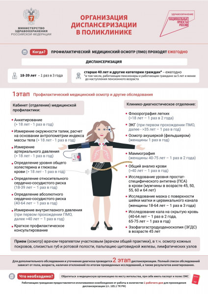 Эти мероприятия позволят получить объективную информацию о состоянии своего здоровья и как можно раньше выявить тяжелые хронические, в том числе – сердечно-сосудистые и онкологические заболевания. Объем исследований и консультаций будет зависеть от пола, возраста, наличия сопутствующих заболеваний.